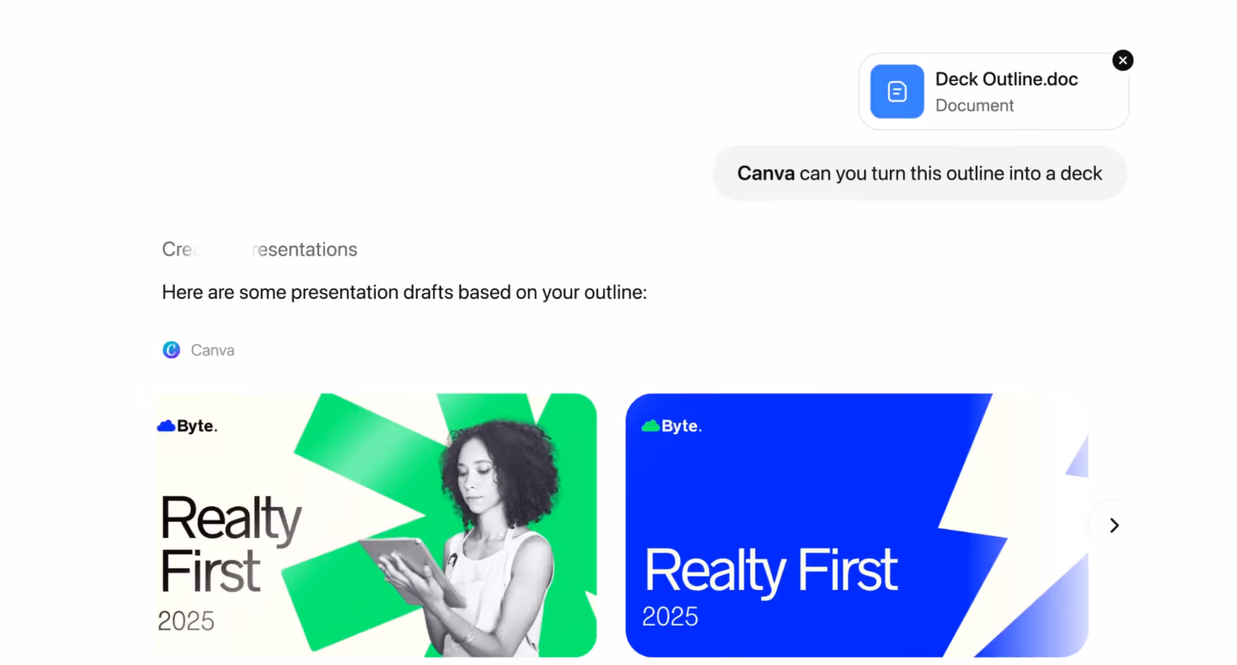 OpenAI’s Apps framework embeds Canva directly in ChatGPT. You connect your Canva account, then prompt ChatGPT to generate posts, presentations, or slides that open as editable Canva designs.