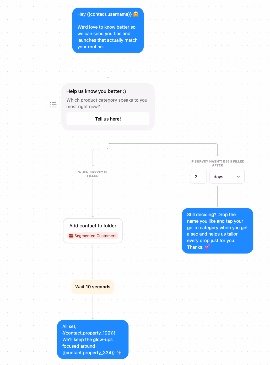 With Inrō’s Segment Your Instagram Audience template, you can automate the entire process — from survey to tagging to personalized confirmation — and set the stage for advanced personalization with AI-powered campaigns.