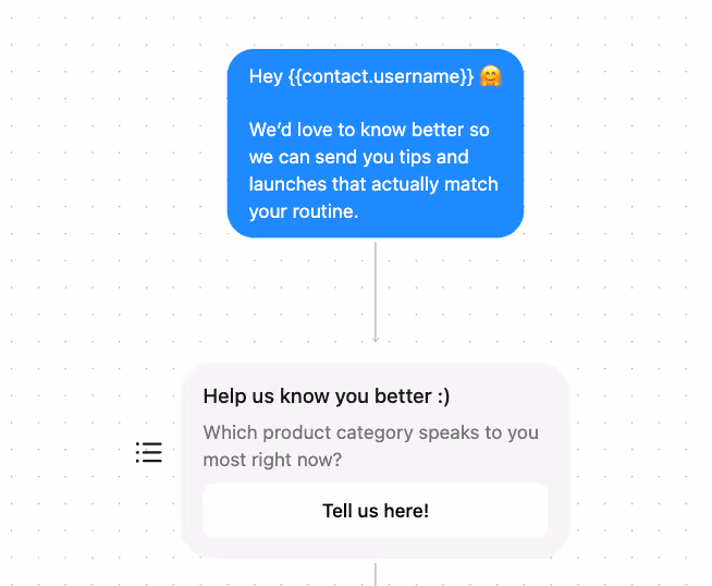 "Hey [Name]! 👋 We’d love to know you better so we can send you tips and launches that actually match your routine. Which product category speaks to you most right now? Tap below to tell us!"