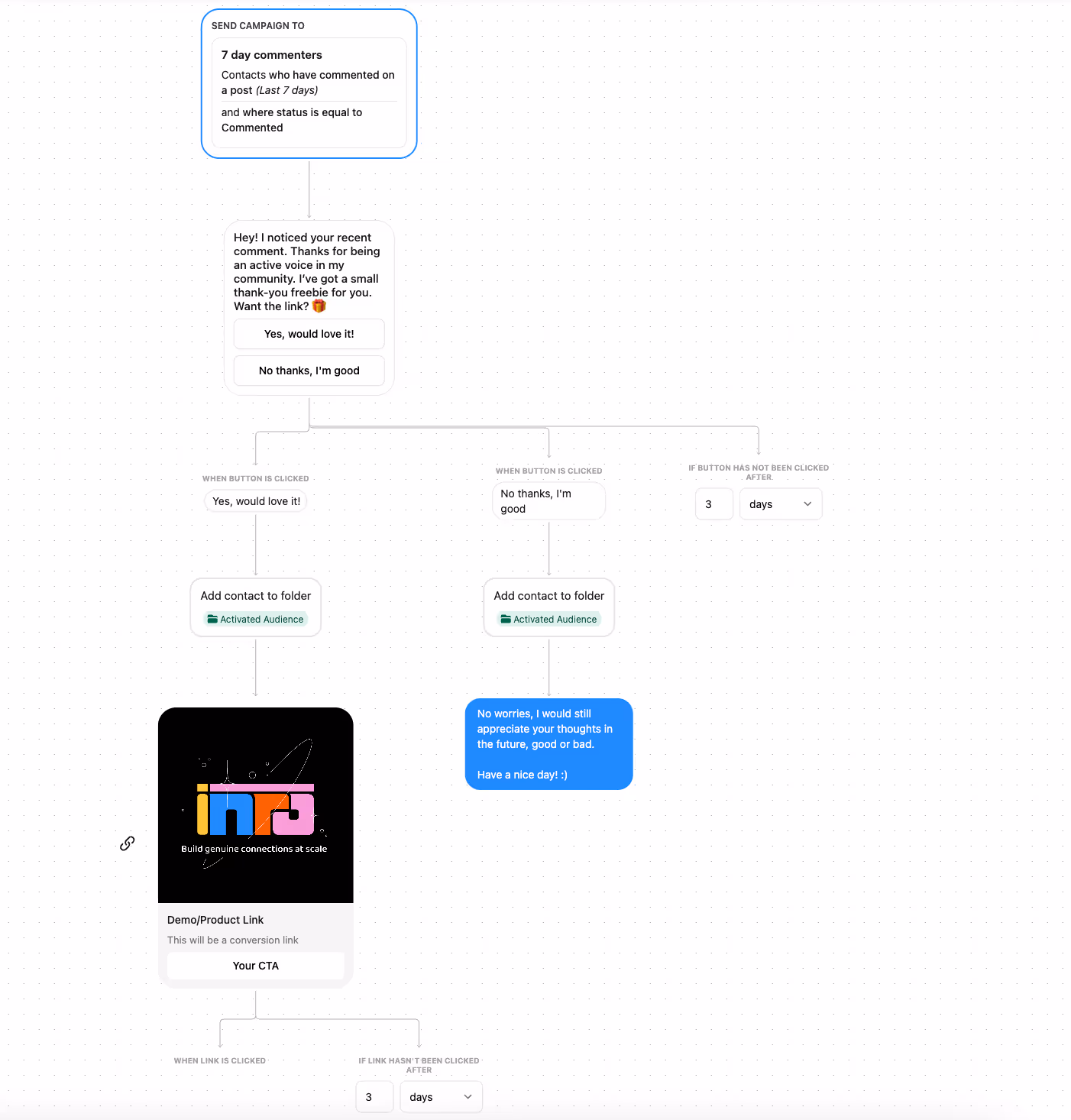 With Inrō’s Reactivate Old Comment Leads template, you can re-engage these users by sending them a personalized DM that thanks them for their past input and invites them back into the conversation with an exclusive freebie. This simple yet powerful campaign reignites interest, strengthens community ties, and turns forgotten interactions into conversion opportunities.