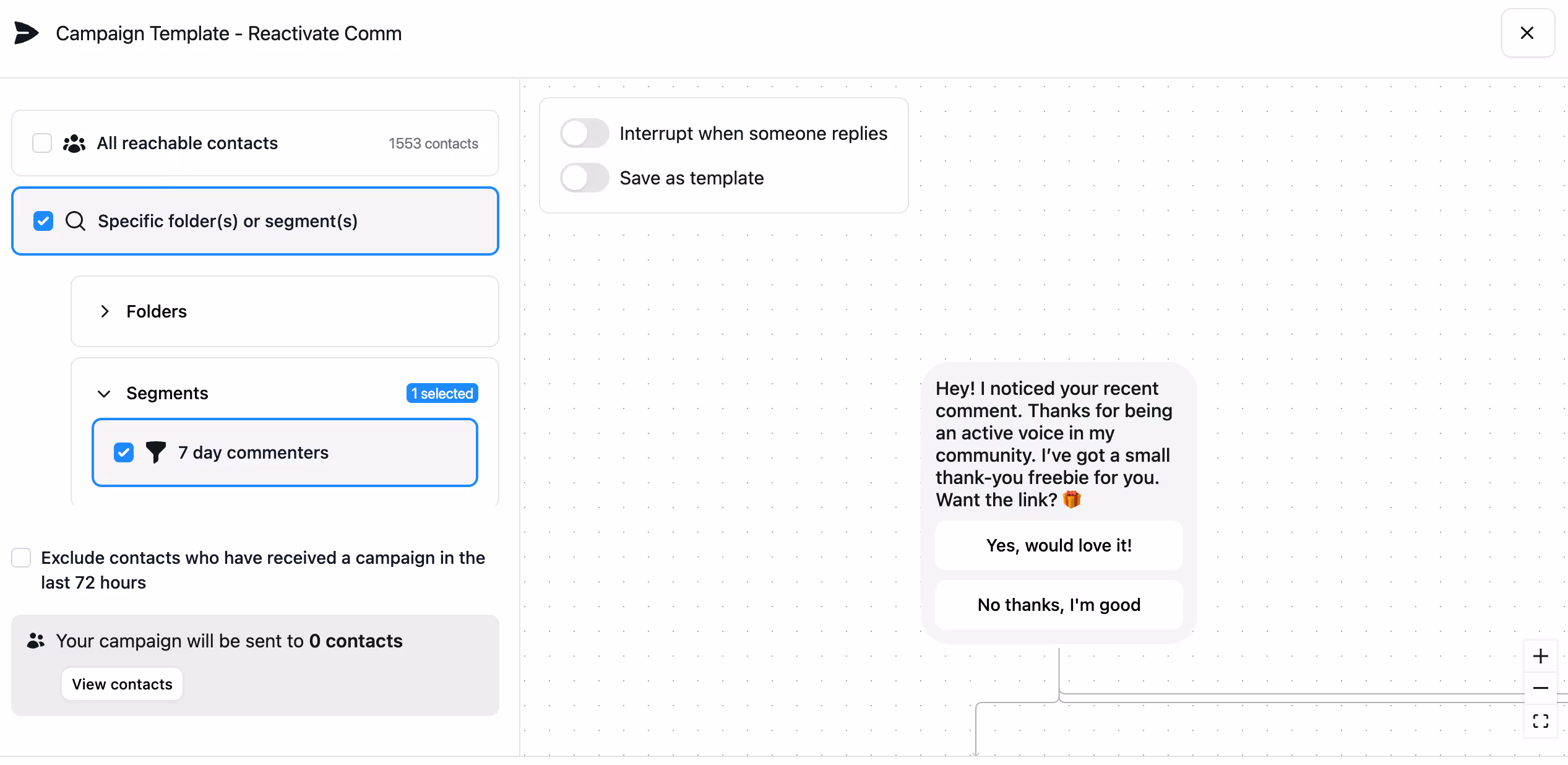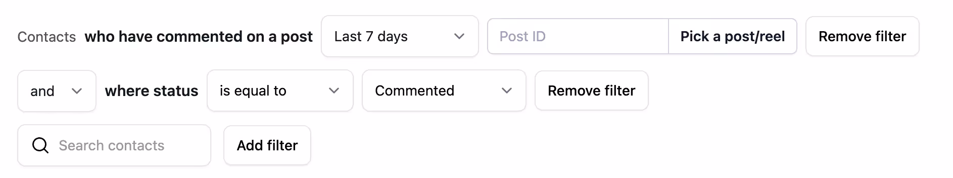 Start by selecting your trigger audience in Inrō’s CRM. For this campaign, choose users who commented on a post within the last 7 days. You can also filter by engagement status (e.g., “Commented”) to get a precise segment — just like in the screenshot.