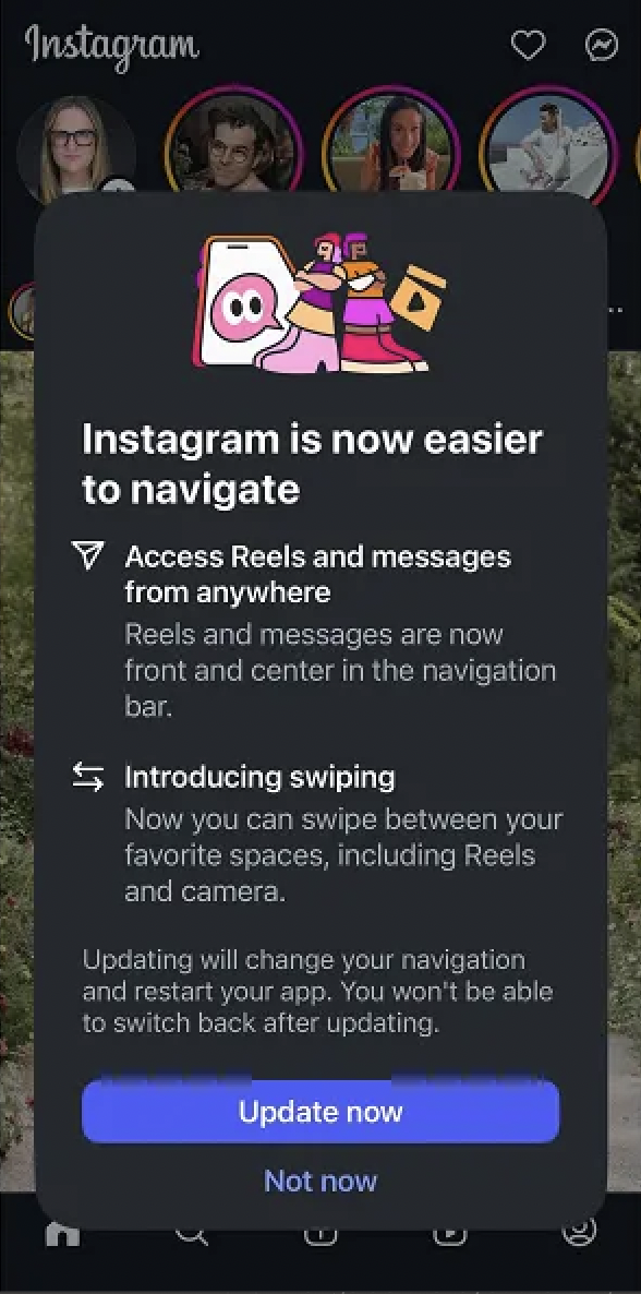 Because of the global rollout of the new Instagram Tabs layout, prioritizing DMs and Reels.