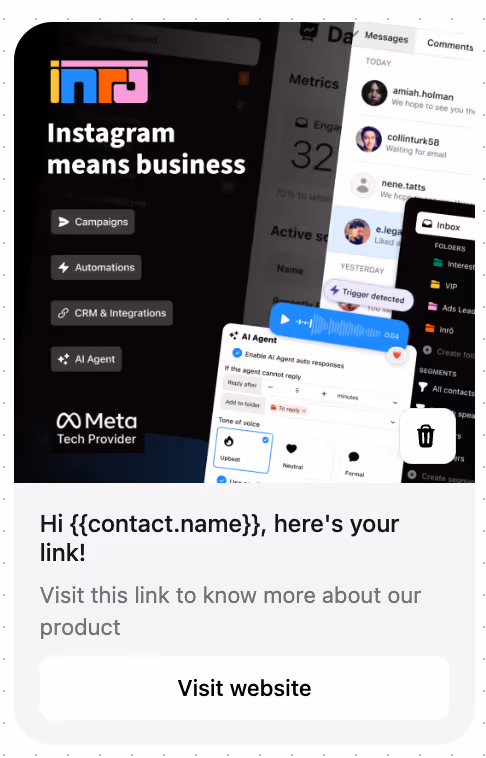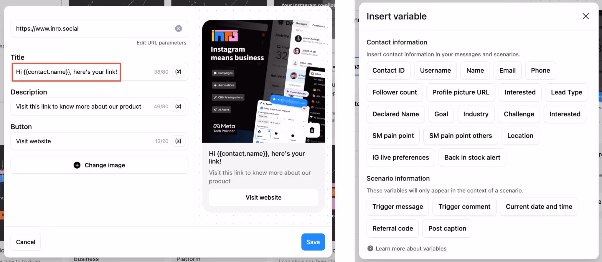 Within Inrō, build personalized DM messages and share links that automatically dispatch when a trigger is detected. For “Link in DM” scenarios, you can enrich each message with: