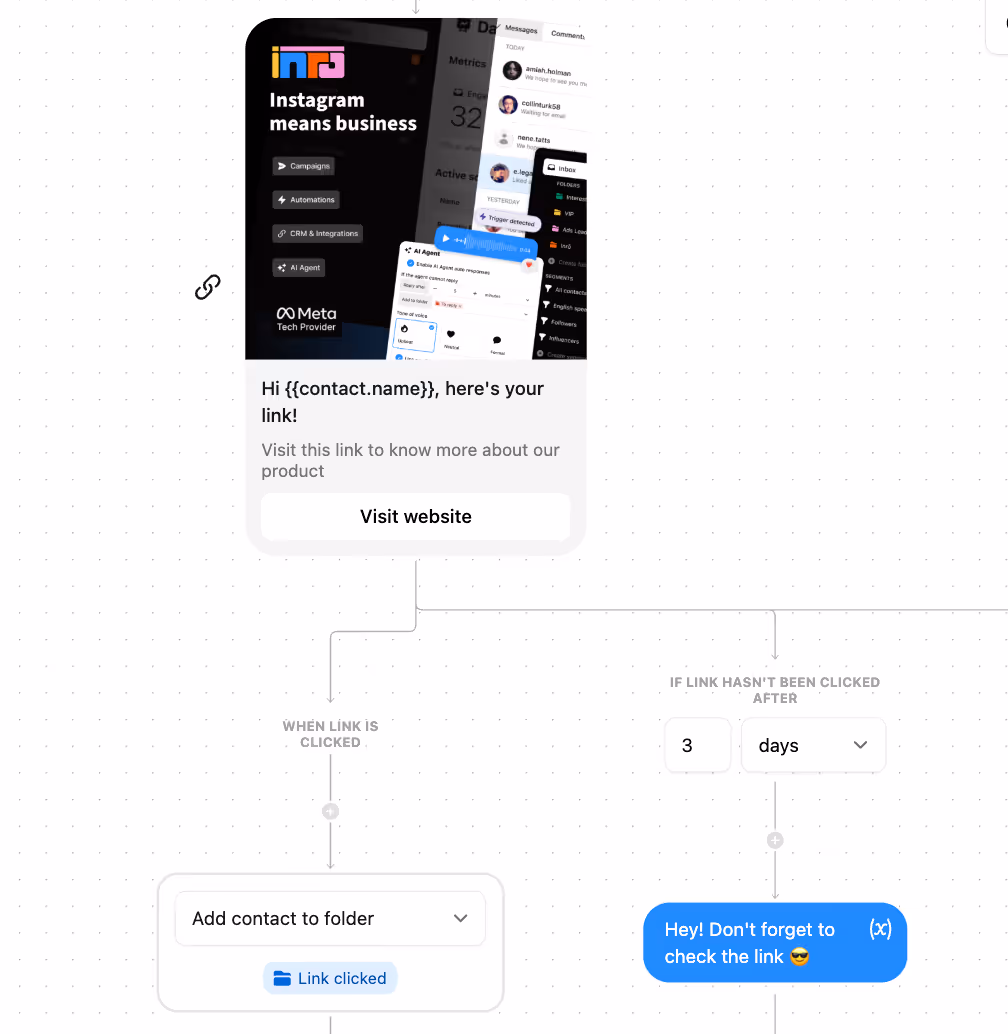 “Link in DM” embeds URLs directly into automated messages—ideal for one-to-one follow-ups. Comment-to-DM automation uses public engagement (comments) as the opt-in trigger, capturing permissions and context in one step.