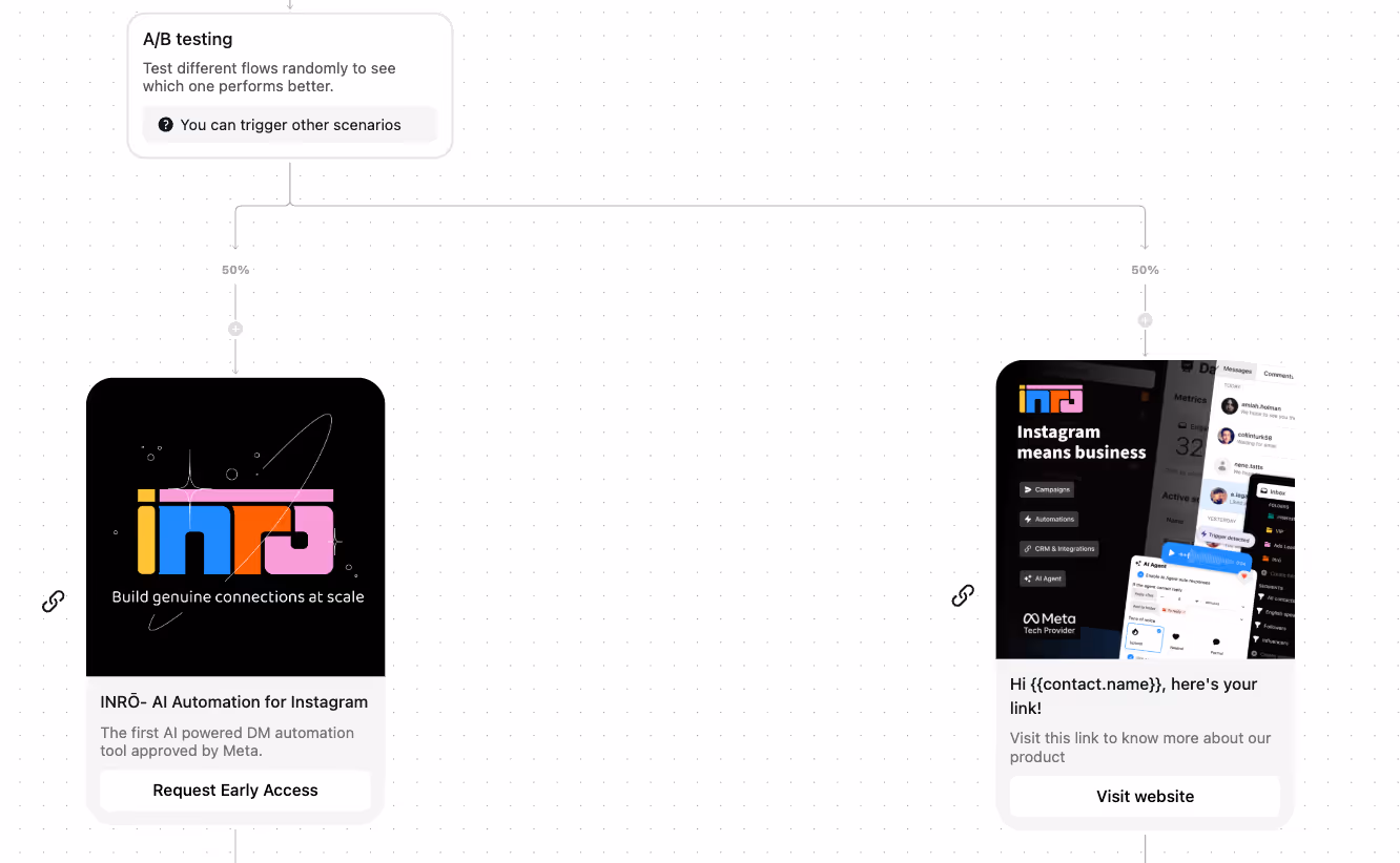 Leverage Inrō’s DM workflow builder to chain follow-up messages, surveys, or downloadable assets. Once a user comments, Inrō handles the entire conversation flow—no manual steps required.