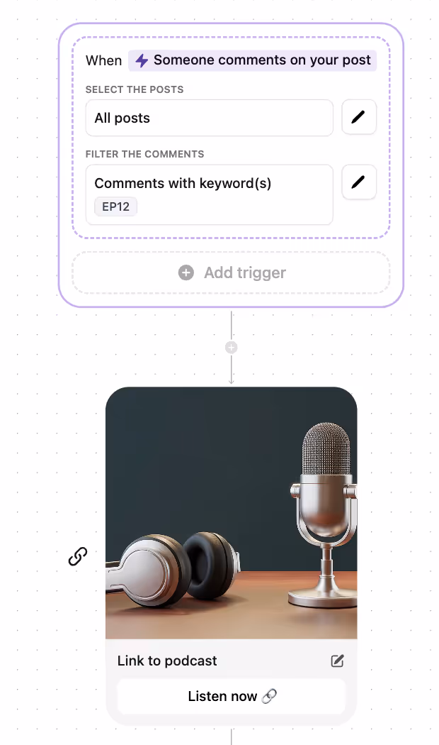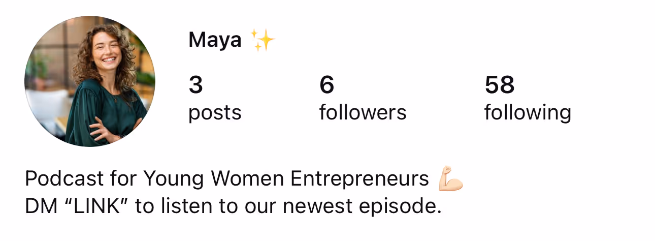 Add a line in your bio—e.g., “🎧 New here? DM LINK for today’s episode”—and pin a “New Episode” Highlight. It works like a smarter link-in-bio: the DM captures the contact in Inrō’s CRM, tags their interest, and lets you retarget them later with episode drops, merch, or Patreon.