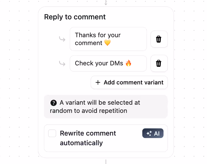 Pro tip: With the Inro AI agent, you can automatically rewrite each comment to add variation and make your responses feel more natural.