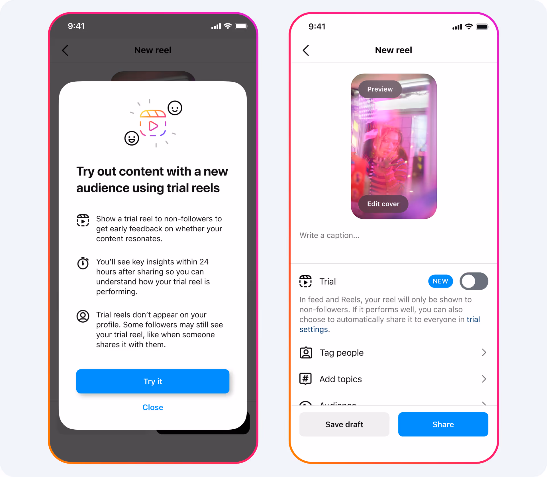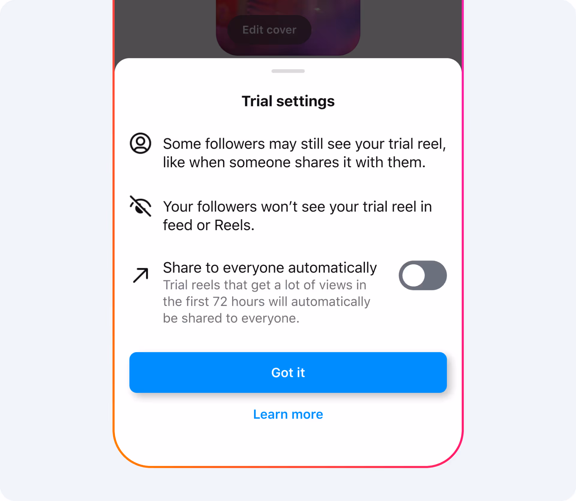 Trial Reels are hidden from your followers and profile grid but are shown to non-followers. You can monitor engagement metrics and decide whether to share the Reel with everyone.
