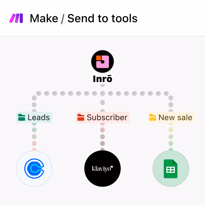 Inrō integrates with over 8000 platforms using Make and Zapier. If there's any specific integration you would love to see or a use case you would like to explore, send us a message at support@inroapp.com